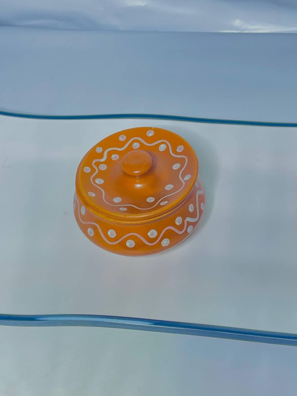 Decorative Ceramic Storage Jar with Lid, Orange with White Dots and Wave Pattern, Traditional Design