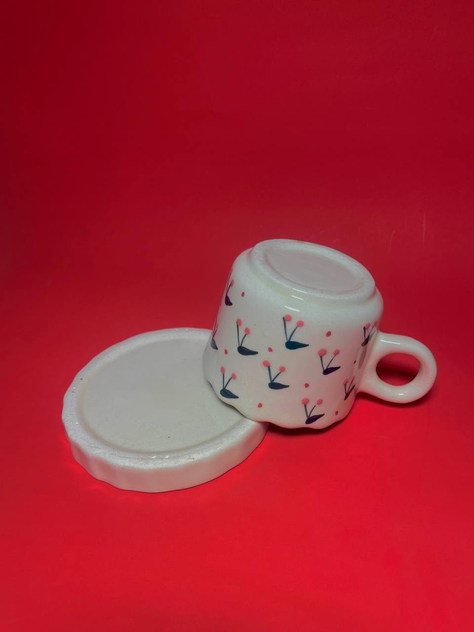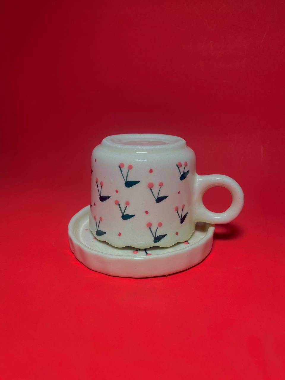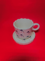 Be the first to review “Ceramic Tea Cup and Saucer Set with Cherry Blossom Pattern, White with Pink and Navy Design, Scalloped Edge”