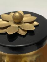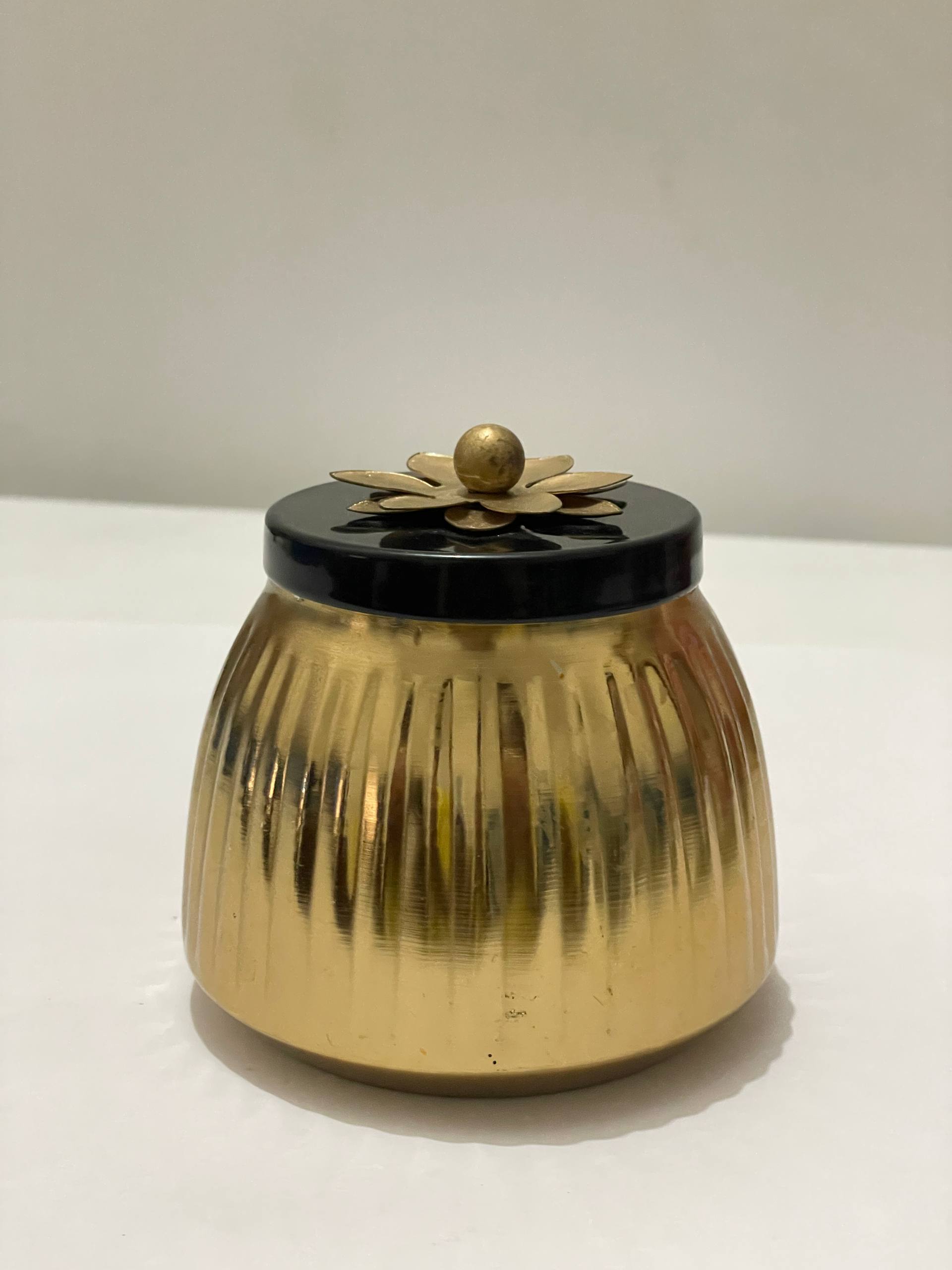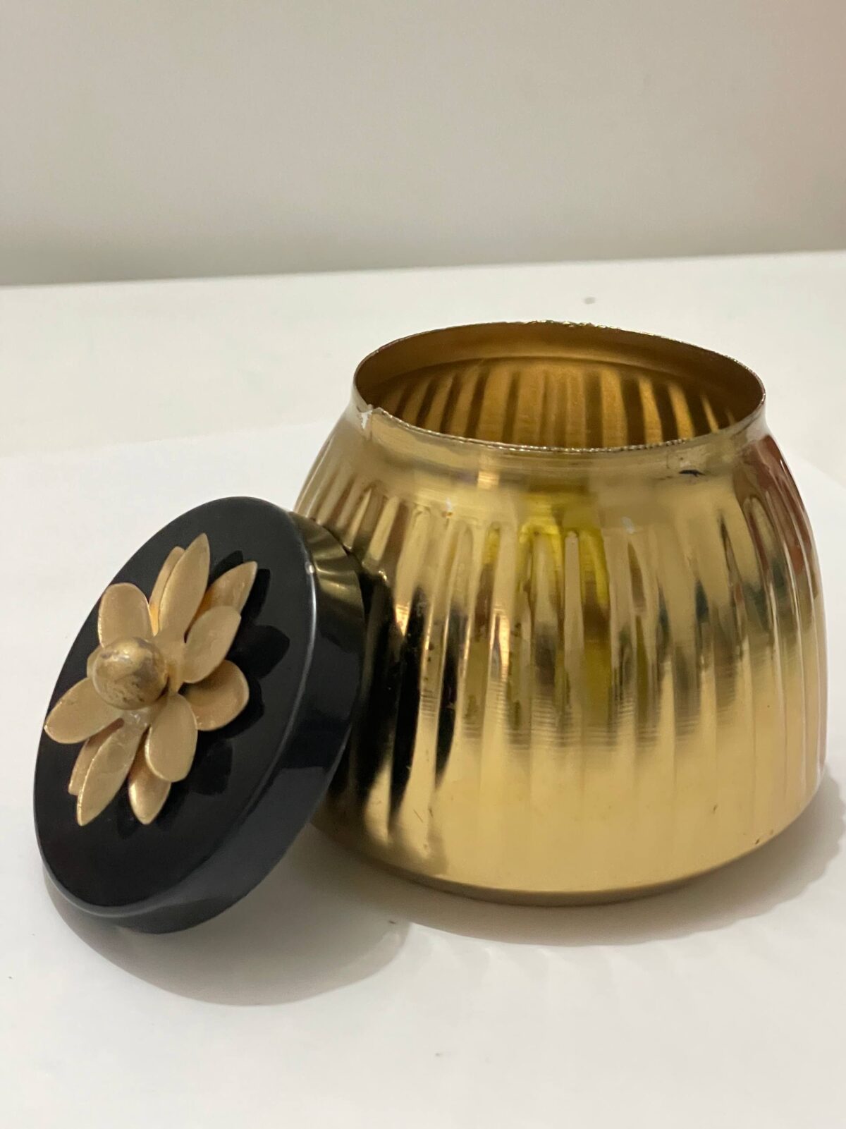 DESIGN FEATURES: Elegant hammered texture metal container with a decorative flower-shaped lid design and smooth golden finish that adds sophistication to any space