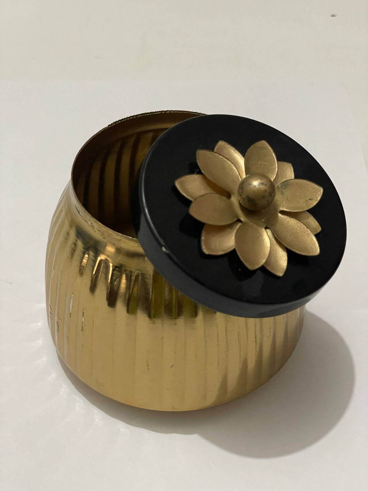 Be the first to review “Elegant Hammered Texture Metal Container with a Decorative Flower-Shaped lid Design and Smooth Golden Finish That adds Sophistication to Any Space” Cancel reply