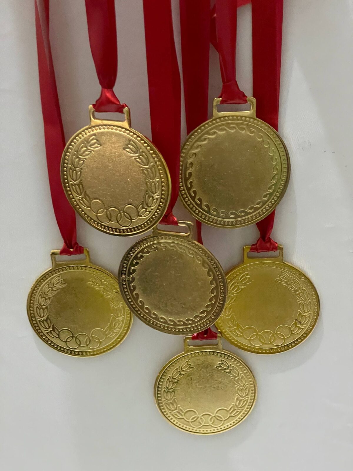 Gold Medal Award Set, 6-Piece with Red Ribbons, Olympic-Style Design for Ceremonies and Competitions